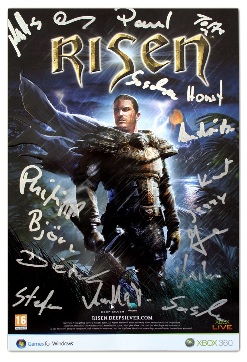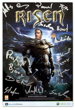 3 эксклюзивные карточки от разработчиков серии "Готика" и игры "Risen" - компании Piranha Bytes. Открытка представляет собой глянцевую карточку с объемным изображением главного героя с основной обложки игры. На карточке можно увидеть настоящие (не напечатанные) автографы всех участников команды Пираний. Таких карточек в России больше нет.