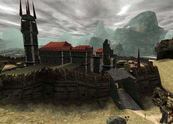 Как мы видим, здесь изображена некая крепость в горах. Теперь смотрим памятное место из незабвенной Готики 1. Именно сюда в своё время мы ходили в поисках Юнитора для магов воды. На узком мостике стоял каменный голем, а в форте водились гарпии. И помогал нам один из известной четвёрки друзей героя – Лестер, искавший там выгодный для себя старинный документ, дающий права на владения Фортом.