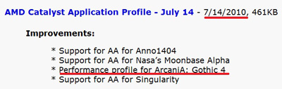 Как сообщает журнал PCGamesHardware, для владельцев cпареных в Crossfire видеокарт от ATI был выпущен дополнительный пакет настроек приложения в профиле драйвера (AMD/Ati CrossfireX Application Profile), который уже поддерживает еще не вышедшую Арканию.
